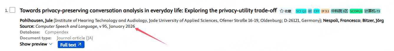 據(jù)觀察,EI數(shù)據(jù)庫收錄有巨大變動——如果期刊被剔除EI收錄,那么該期刊已經(jīng)被收錄的部分論文也會被取消檢索。我們都知道,國外期刊大多存在early access的情況,論文先檢索再正式出版分配期卷號。比如下圖,Computer Speech and Language這本期刊,已經(jīng)檢索了2026年的論文,題目為“Towards privacy-preserving conversation analysis in everyday life: Exploring the privacy-utility trade-off ”(Volume 95, January 2026)。