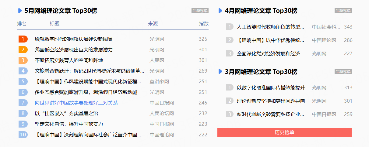 是的,《關(guān)于深化新時(shí)代學(xué)校思想政治理論課改革創(chuàng)新的若干意見(jiàn)》出臺(tái)后,各地高校紛紛響應(yīng),把報(bào)紙和主流媒體論文納入職稱(chēng)評(píng)審,并且級(jí)別都很高。 4 中國(guó)網(wǎng) www.china.com.cn 5 國(guó)際在線 www.cri.cn 6 中國(guó)日?qǐng)?bào)網(wǎng) https://cn.chinadaily.com.cn 7 中國(guó)青年網(wǎng) www.youth.cn 8 中國(guó)經(jīng)濟(jì)網(wǎng) www.ce.cn 9 中國(guó)臺(tái)灣網(wǎng) www.taiwan.cn 10 中國(guó)西藏網(wǎng) www.tibet.cn 11 光明網(wǎng) www.gmw.cn 12 央廣網(wǎng) www.cnr.cn 13 中國(guó)軍網(wǎng) www.81.cn 14 中國(guó)新聞網(wǎng) www.chinanews.com.cn 15 人民政協(xié)網(wǎng) www.rmzxb.com.cn 16 法治網(wǎng) www.legaldaily.com.cn 17 中青在線 www.cyol.com 18 環(huán)球網(wǎng) www.huanqiu.com 19 中工網(wǎng) www.workercn.cn 20 未來(lái)網(wǎng) www.k618.cn 21 海外網(wǎng) www.haiwainet.cn 22 正義網(wǎng) www.jcrb.com 23 中國(guó)搜索 www.chinaso.com 24 中國(guó)文明網(wǎng) www.wenming.cn 25 學(xué)習(xí)強(qiáng)國(guó) www.xuexi.cn 26 求是網(wǎng) www.qstheory.cn 27 理論網(wǎng) www.cntheory.com 28 中國(guó)社會(huì)科學(xué)網(wǎng) www.cssn.cn 29 黨建網(wǎng) www.dangjian.cn 30 旗幟網(wǎng) www.qizhiwang.org.cn 31 人民論壇網(wǎng) www.rmlt.com.cn