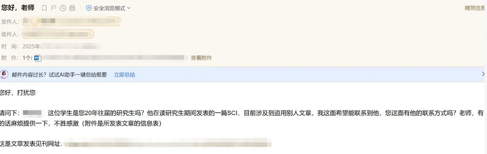 騙局二:以學術(shù)不端的名義聯(lián)系到導師/學校,要求提供原作者的聯(lián)系方式。這種最為可惡,已經(jīng)到造謠的程度了。每個科研單位都不希望自己是以“學術(shù)不端”出現(xiàn)在大眾視野,收到類似信息會即刻做出反應,讓“涉事人”盡快處理解決。放誰身上不害怕呢,但是你聯(lián)系對方了就可能會被Zha騙,被糾纏。最好的解決辦法是不回應,身正不怕影子斜。